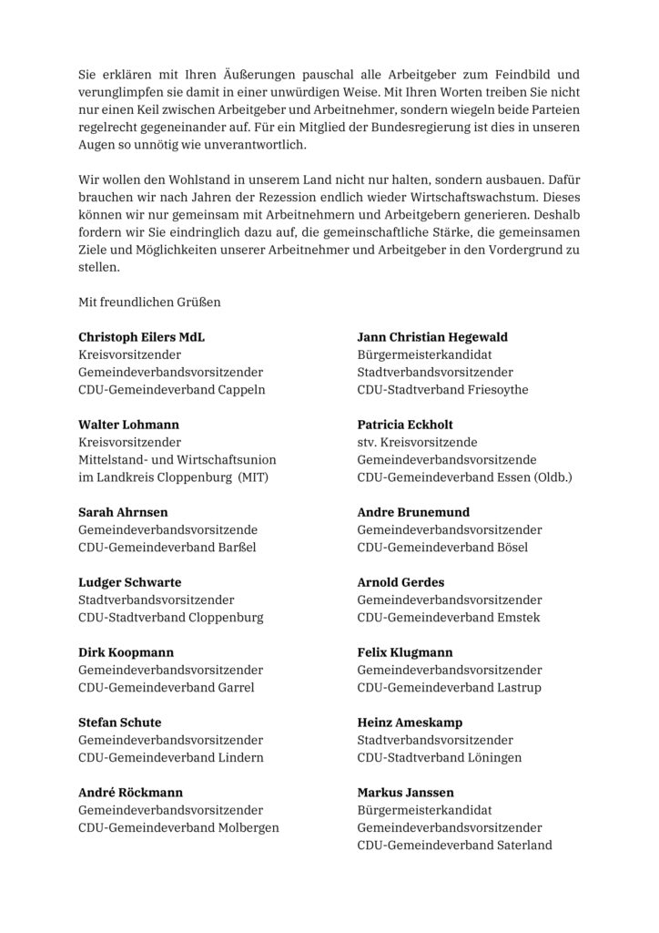 Anlässlich der aktuellen Äußerungen von Bundesarbeitsministerin Bärbel Bas haben der Kreisvorsitzende des CDU-Kreisverbandes Cloppenburg, Christoph Eilers MdL, der MIT-Kreisvorsitzende, Walter Lohmann, sowie alle Vorsitzenden der CDU-Stadt- und Gemeindeverbände im Landkreis Cloppenburg den beigefügten offenen Brief „Nicht gegen, sondern mit den Arbeitgebern in Deutschland“ soeben an Frau Bas versendet und um Stellungnahme gebeten.